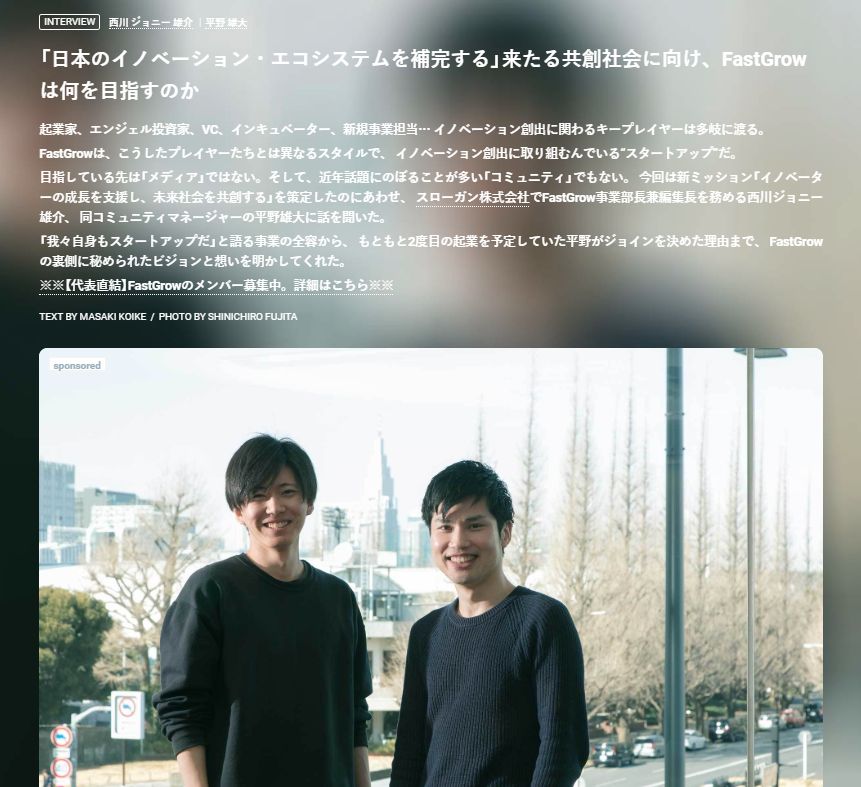 成長ポテンシャルが高くこれから伸びるマーケットにいることが、事業成長において非常に重要であることは自分の起業経験からも痛感していますが、その点FastGrowはスローガンの中核事業になりうるポテンシャルをもっていると思っています。これまでスローガンの事業は丁寧な対人コミュニケーションによって着実な成長を積み上げていくスタイルで伸びてきましたが、そのカルチャーや想いは受け継ぎつつ、FastGrowではwebメディア事業からスタートしているメリットを活かして、取材やイベントで出会ったステークホルダーと共創するかたちで、非連続な成長を実現したいと思っています。
